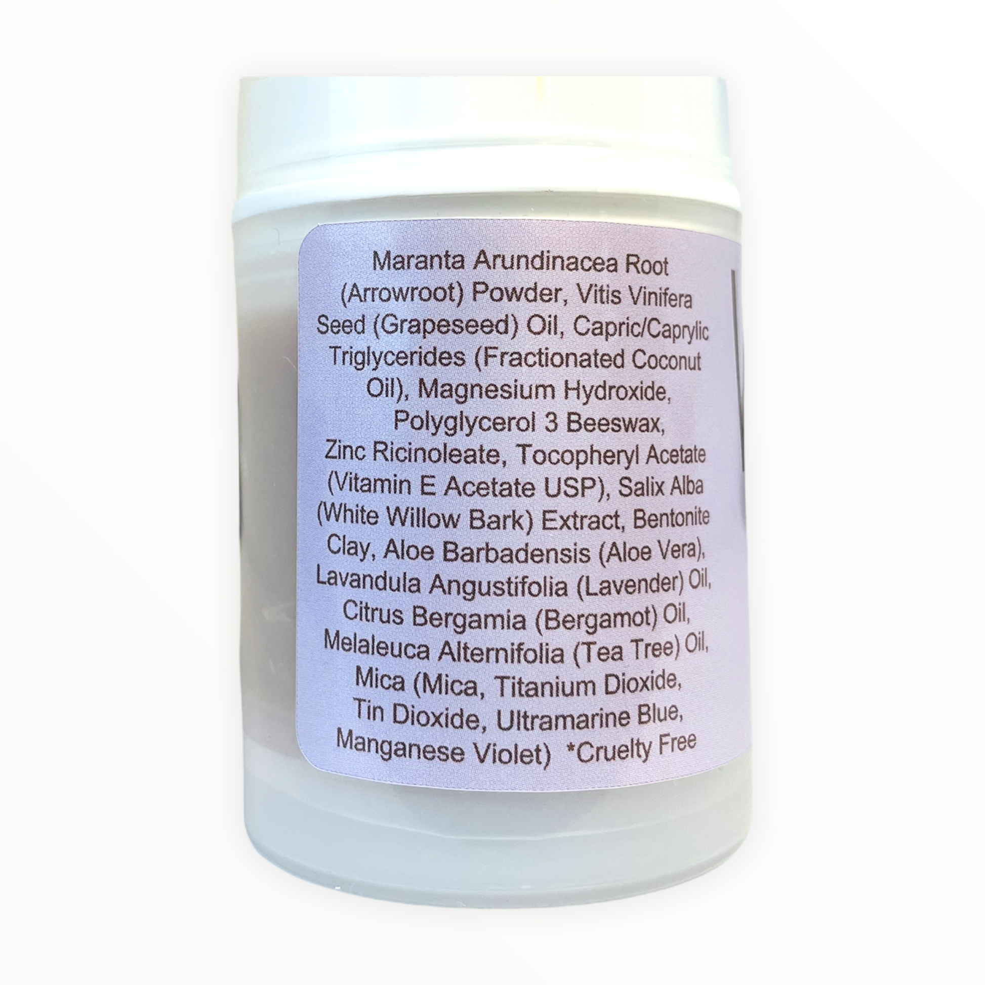 Arrowroot powder, fractionated coconut oil, grape seed oil, magnesium hydroxide, CB wax, zinc, willow bark extract, bentonite clay, aloe vera and vitamin E.